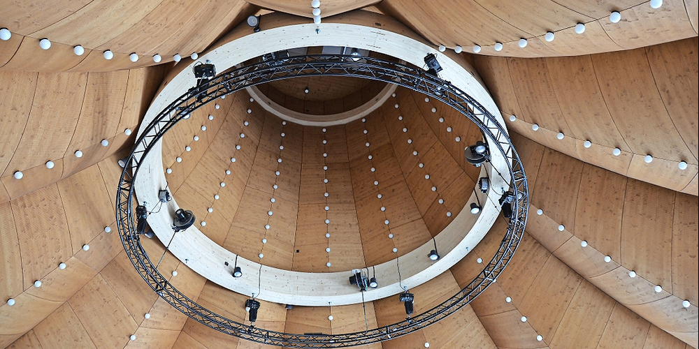 Für eine spezielle Akustik im Zauberhut sorgt der mehrheitlich aus Holz gefertigte Baldachin, wie das Dach im Fachjargon genannt wird. Von dort aus sollen dereinst Lichtshows nicht nur Kinderaugen zum Strahlen bringen.