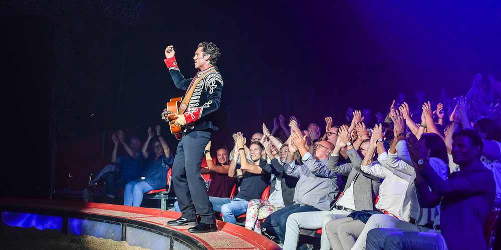 Der Stargast wartet hoch oben bei der Zirkuskapelle. «Let’s start the show», ruft Bastian Baker ins Publikum. Im Glitzerjackett und mit Zahnpastalächeln springt der Westschweizer Sänger die Stufen in die Manege herab und lässt sich neckisch von der Bingo-Tanzgruppe umtänzeln. Gleissendes Licht, der Geruch von Sägemehl liegt in der Luft. Showtime im Chapiteau!