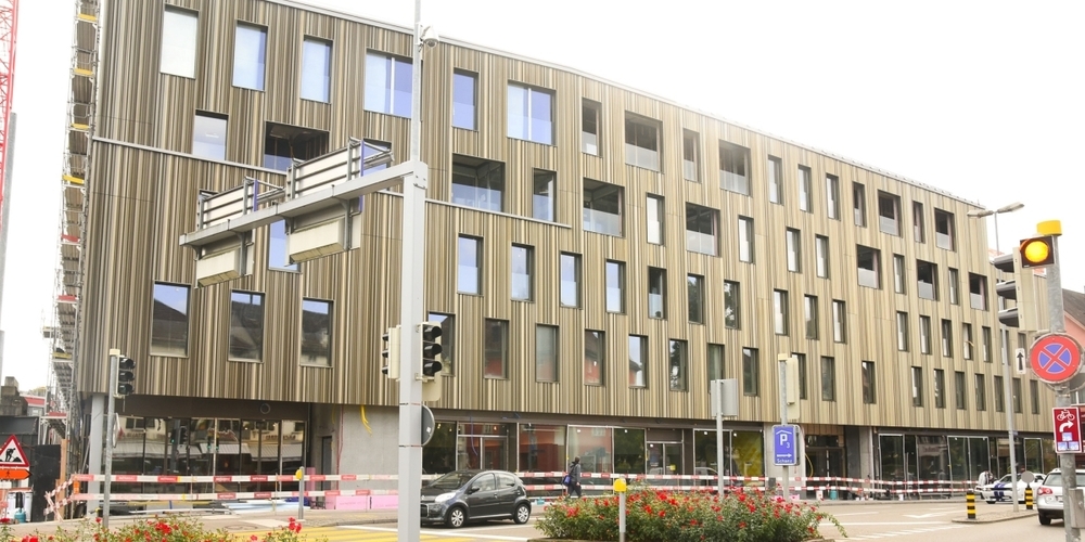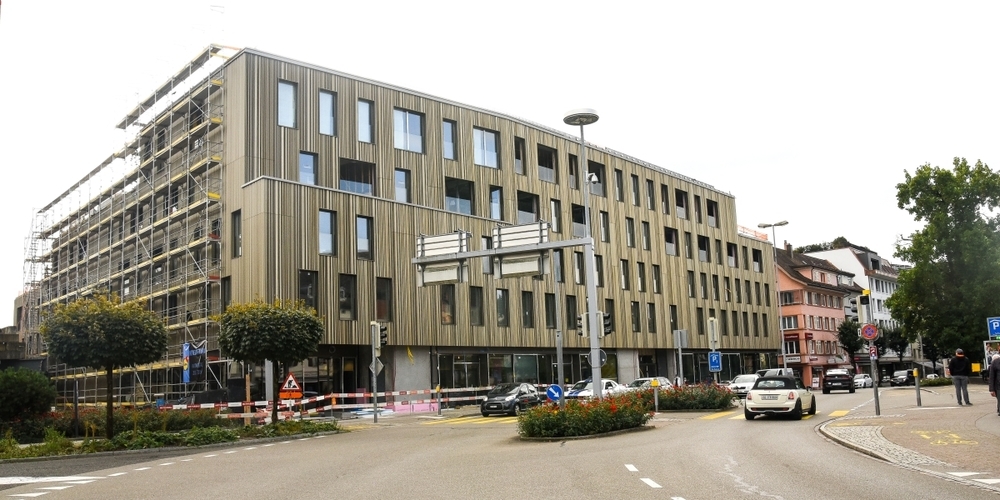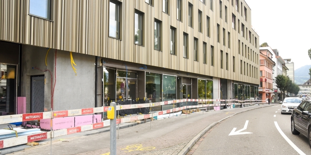 Das Gerüst ist teilweise schon abgebaut und die bronzefarbene Fassade zeigt sich: Das ENTRA in Rapperswil ist fast fertig und Ende Oktober ziehen die ersten Geschäfte ein.