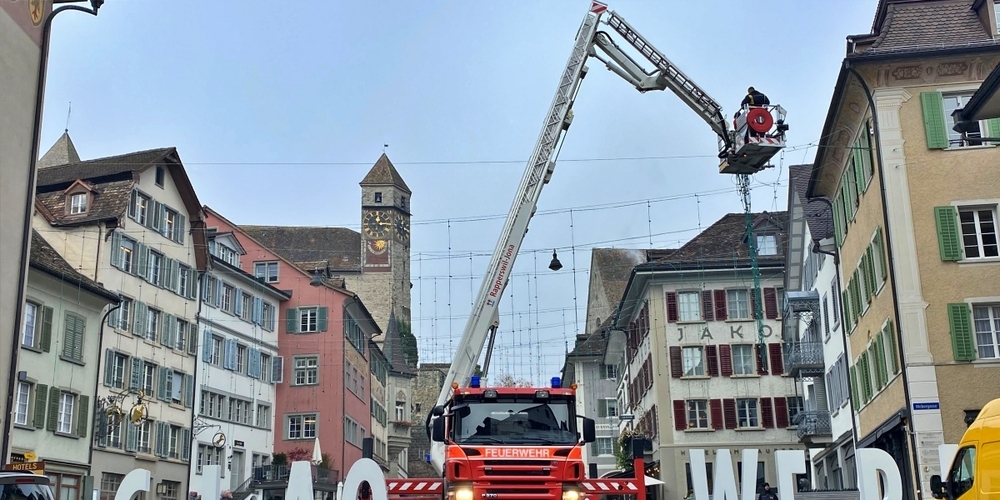 Nicht nur auf dem Fischmarktplatz, sondern auch auf dem Hauptplatz wurde gute Arbeit geleistet: Seit dem 11. November hängt die beliebte Weihnachtsbeleuchtung – aufgehängt durch Arbeiter der Feuerwehr Rapperswil-Jona – welche dann am Freitag dem 19. November 2021 angezündet wird.