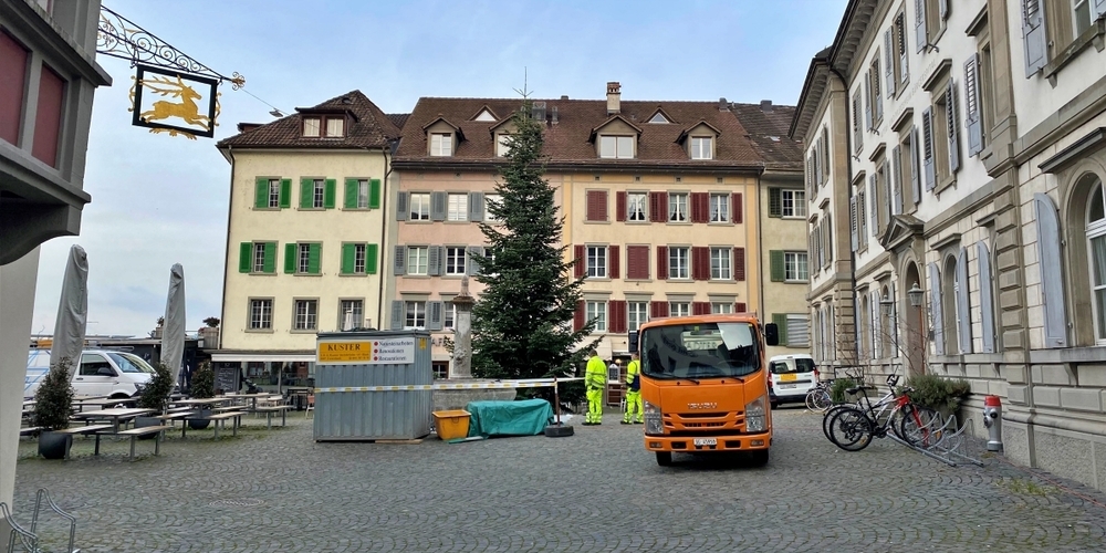 Der 12 Meter hohe Weihnachtsbaum in Rapperswil wurde am Donnerstag Morgen auf dem Fischmarktplatz aufgestellt und auch die Weihnachtsbeleuchtung hängt bereits über dem Hauptplatz.